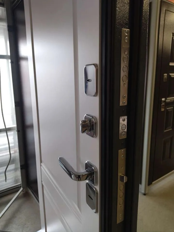 Дверь комплектуется двумя сувальдными замками Гардиан 30.11 и Гардиан 30.01 четвертого класса безопасности, ночной задвижкой, а также алюминиевой дверной ручкой TOR XL в цвете хром.