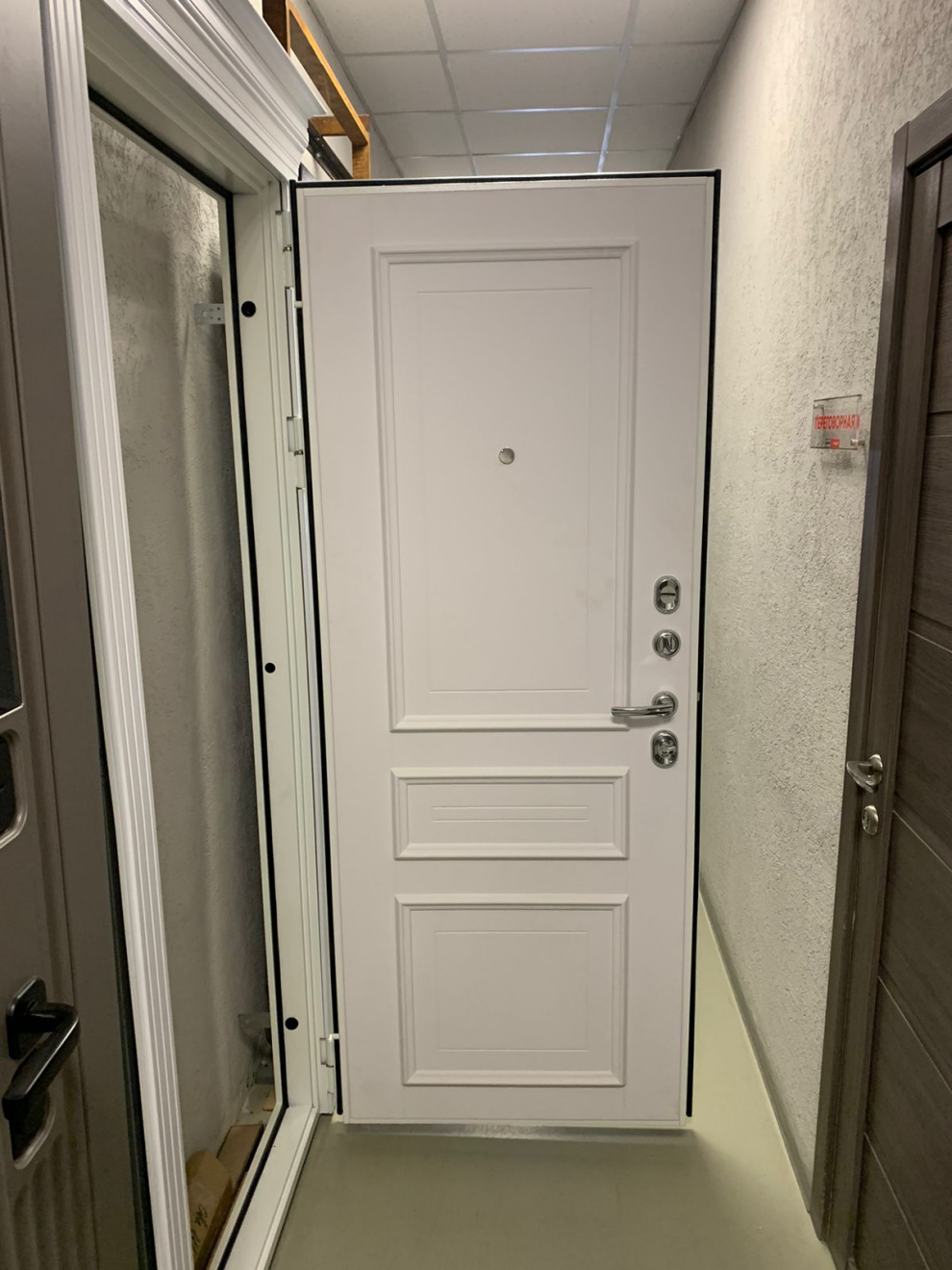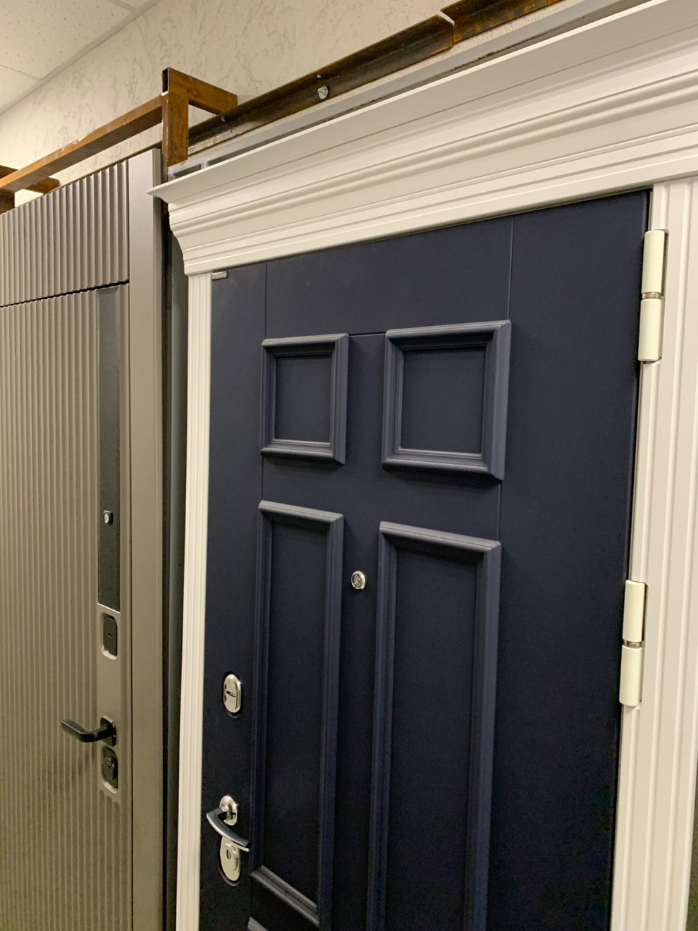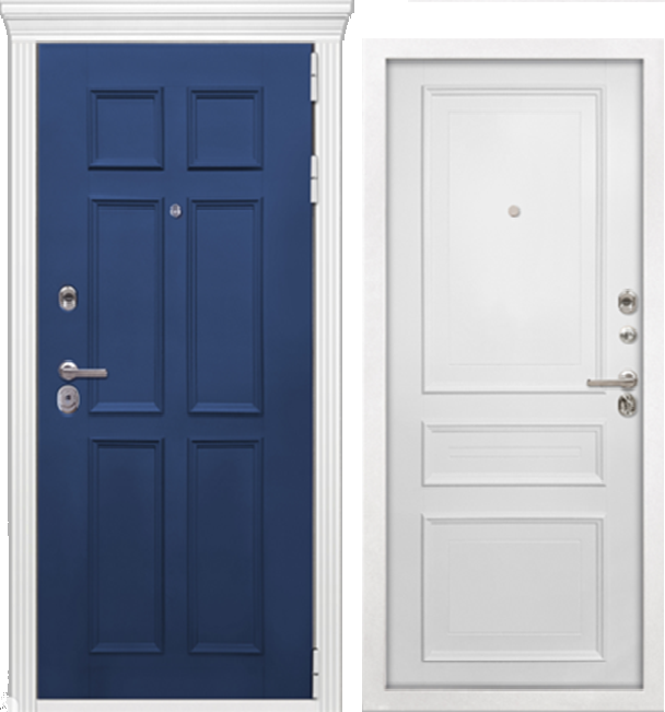 Стальная дверь СТРАЖ 3K Барцано в цвете внешней панели Темно-синий софт и внутренней панели цвета Софт белый снег с 3-мя контурами уплотнения для необходимой защиты Вашей квартиры от посторонних шумов и запахов, внутреннее наполнение с применением базальтовой плиты надежно уберегут Вас от проникновения холода. Замочные карманы с механизмами 4 и 2 класса взломостойкости