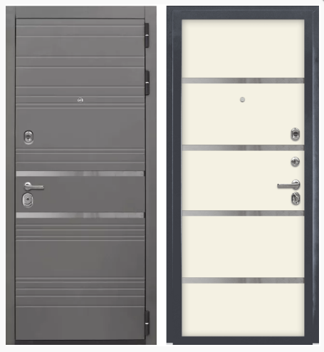 Стальная дверь СТРАЖ 3K Х42 в цвете внешней панели Софт платина и внутренней панели цвета Софт милк с 3-мя контурами уплотнения для необходимой защиты Вашей квартиры от посторонних шумов и запахов, внутреннее наполнение с применением минеральной плиты Knauf надежно уберегут Вас от проникновения холода. Замочные карманы с механизмами 4 и 2 класса взломостойкости